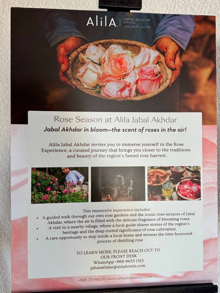 Alila Jabal Akhdar is about 30 miles from Nizwa beyond which you can only drive a 4×4 car as you climb up the mountain. It’s very beautiful, but Saiq village, home to Anantara, is about 30 minutes (18 miles) away.