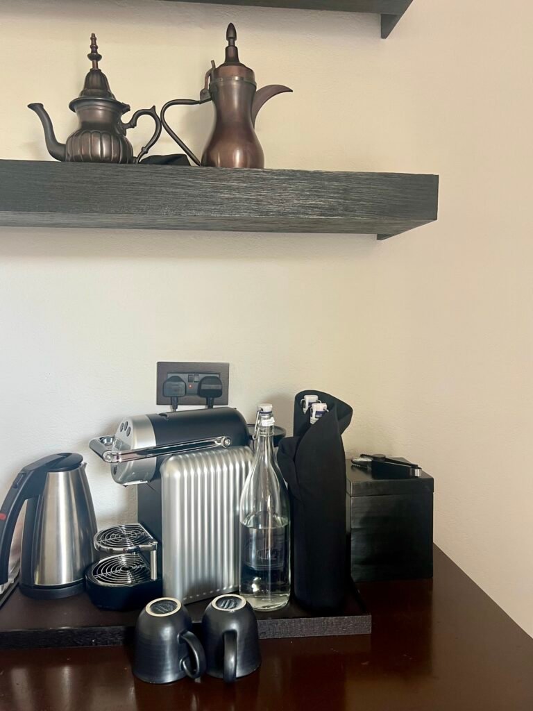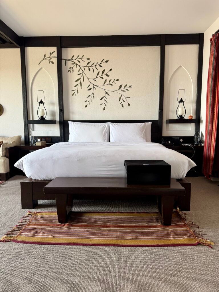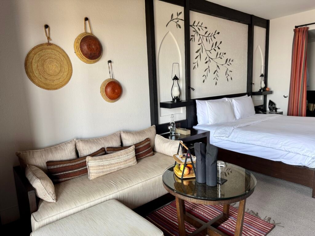 Our room was in the second room cluster from the main pool and located on the top right of the unit. The room is designed with earthy Omani accents, including hand-painted juniper-leaf motifs. Extensive wood use makes the room slightly dark but blends well with the surroundings. The bedroom was spacious Our welcome amenity included local sweets which we appreciated.