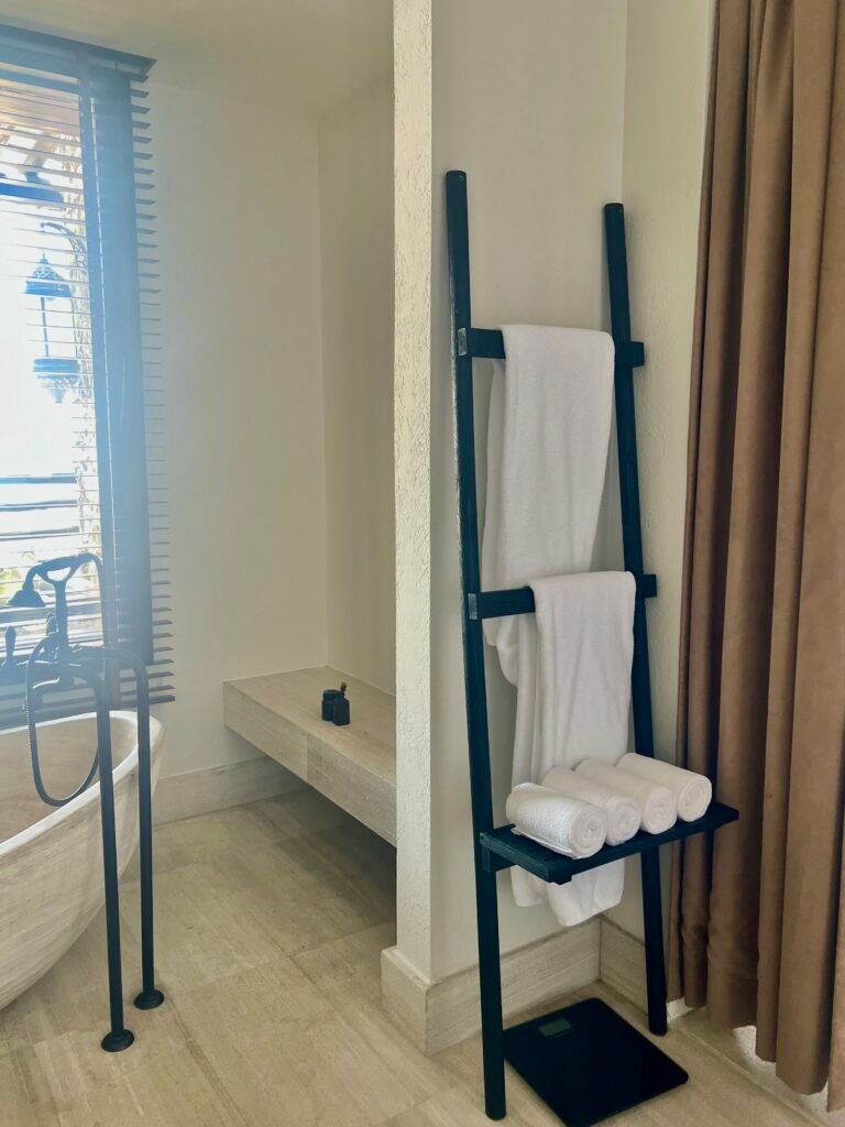 The bathroom was spacious with a double vanity unit and a separate shower and bathroom. The key feature though was the free standing bath tub with a very earthen tone. The bath tub overlooked the terrace with open mountain views and made the bathroom very bright.