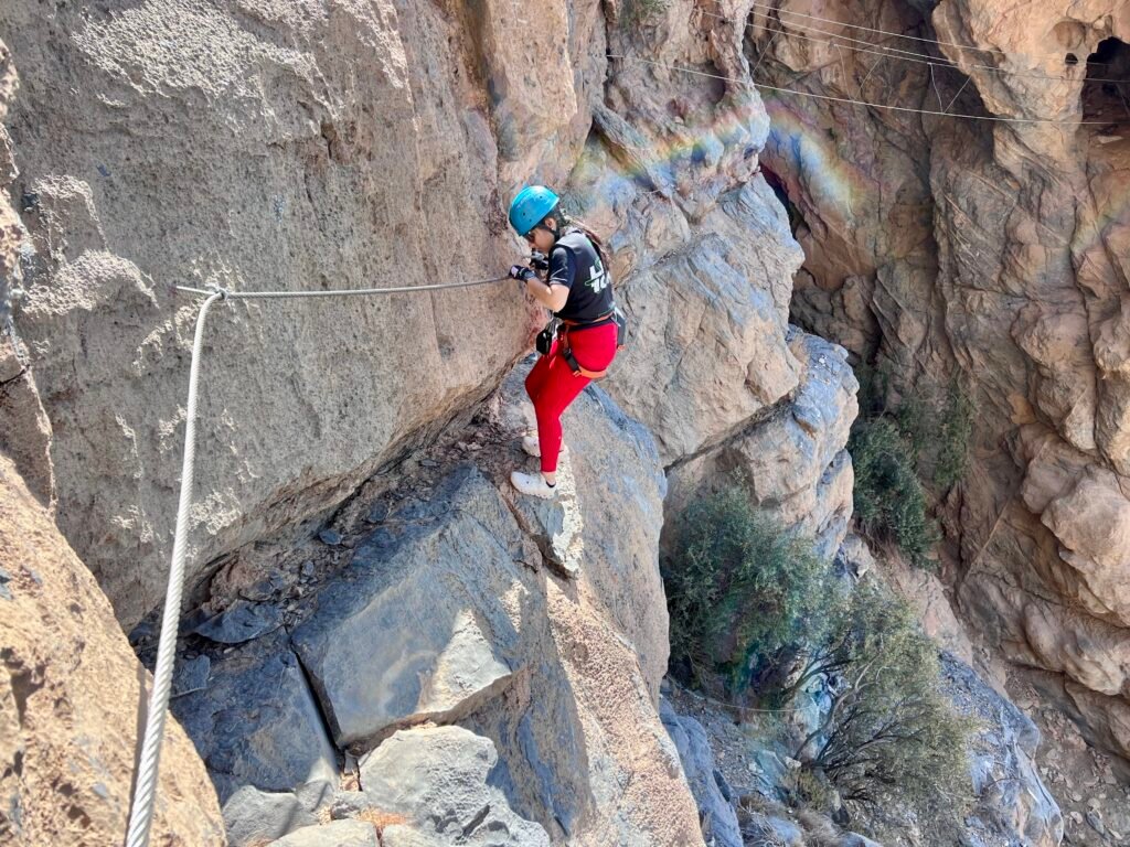 One of their most popular activities is the Via Ferrata (Italian for “iron path”) experience. Via Ferrata is a protected climbing route that allows non-expert climbers to traverse difficult terrain safely using a system of fixed cables and bridges. What we didn’t realise was that the experience starts right by the Rose Lounge where we dined and now we’re climbing just below it!