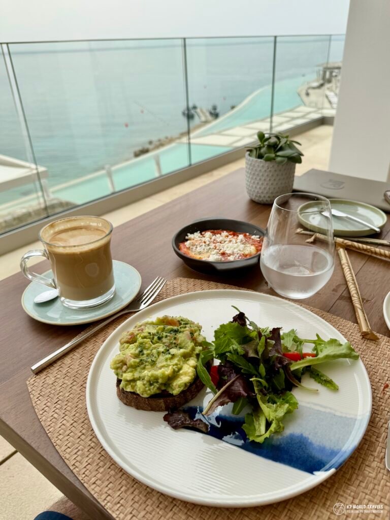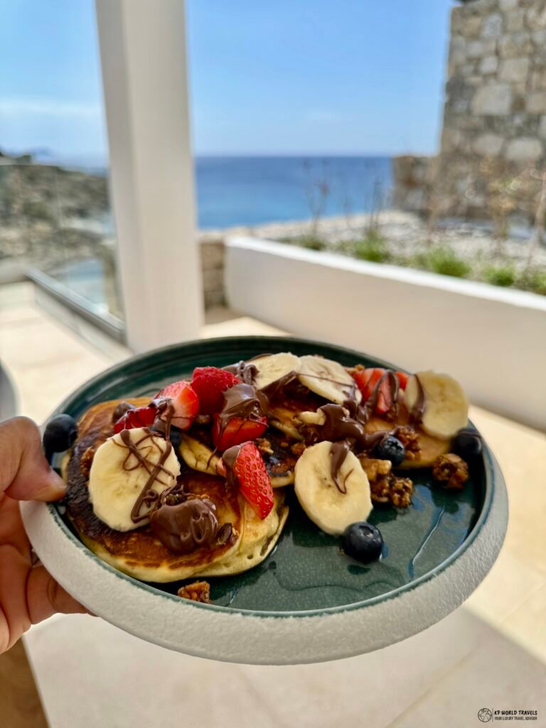 After we completed the check-in formalities, a buggy came to pick us up to escort us to our room which was a few minutes away. On the way, the staff gave us a quick tour of the property including the restaurants and stunning infinity pool. You can enjoy the views of the Aegean sea as we drove up to our room. If you’re okayay with the slopes, this is easily walkable!