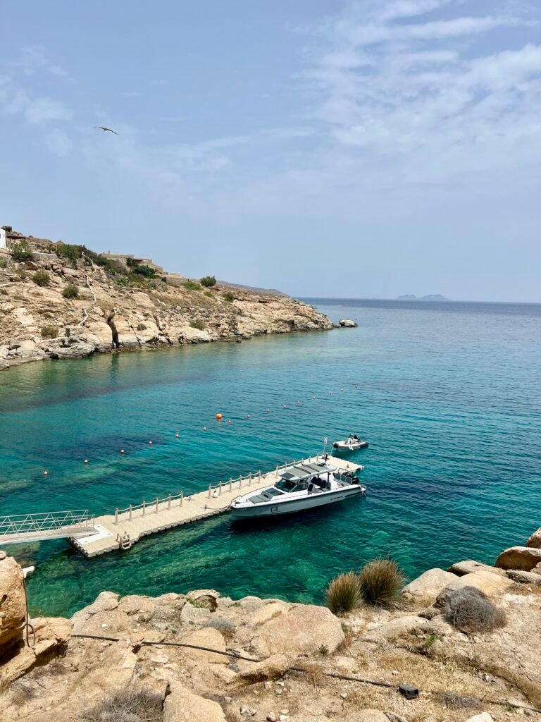 The hotel offers speed-boat transfers to Scorpios Beach Club and other beach clubs in the south of the island. We decided to try out this service and it was amazing! As the hotel is located on a hill, we walked quite a few stairs down to get to the yacht. However, it was well worth it!