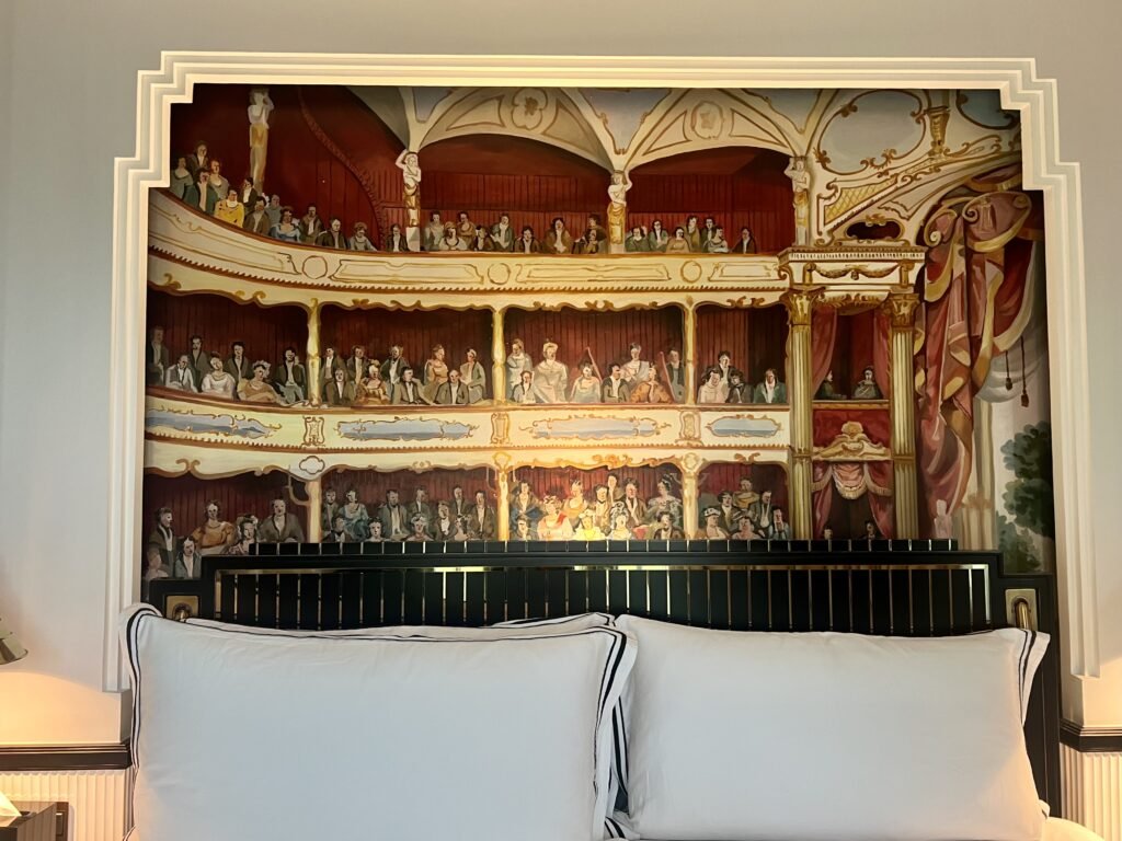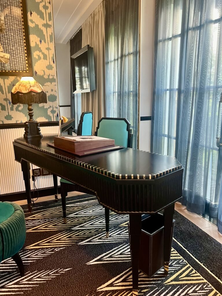 The bedroom which was as stunning as the rest of the Suite. The wallpaper behind the bed was gorgeous. The bedroom had a lovely study desk. Each of the rooms had a small French Juliet balcony. In total, our room had five of them; three in the bedroom, one in the living room and one in the bathroom.