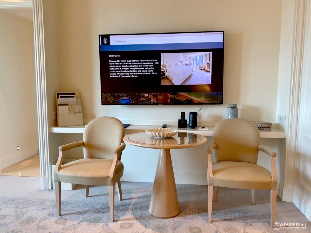 Across the bed, we had nice views of the Doha business district and the beach. Of course, a higher floor room would have much better views than we did. We also had a second TV in the room, which we didn’t turn on during our stay.
