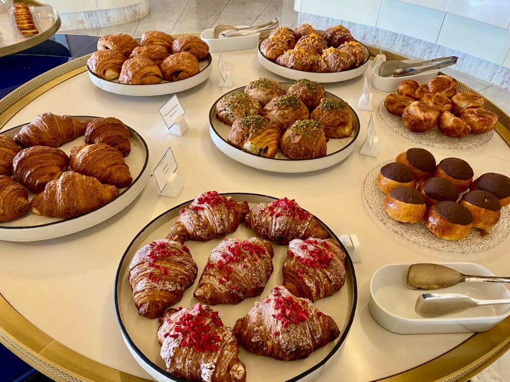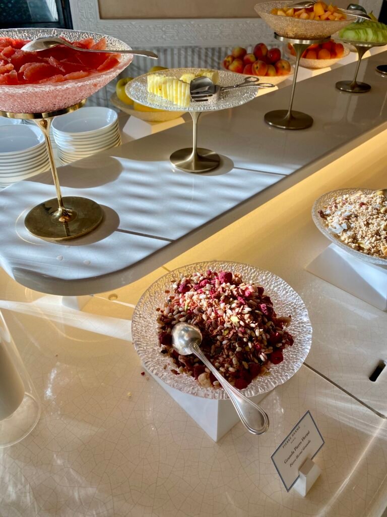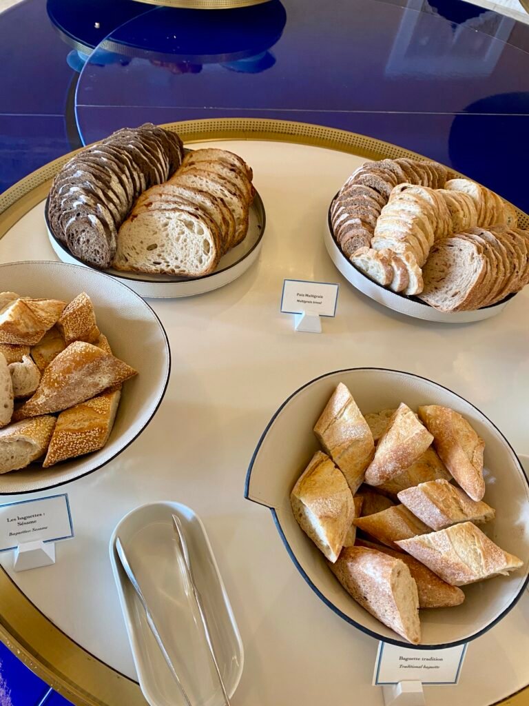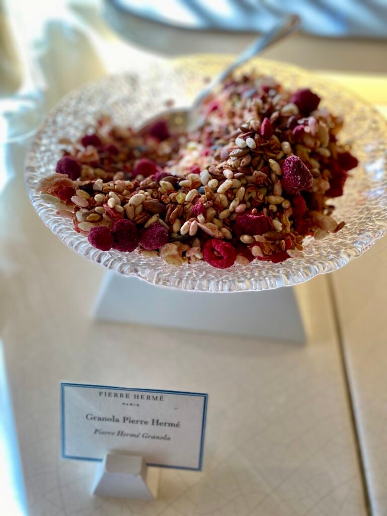 Breakfast was served by the poolside at Le Pavillon de la Piscine. In the mornings, it was beautiful to sit outside in the sunshine! Breakfast included a selection of buffet items along with a small a la carte menu. The a la carte menu was mainly egg-based with a few sweet options. The buffet included an extensive Pierre Hermé pastry selection along with the usual continental options and cereals. We tried the pistachio-filled croissant and it was delicious!