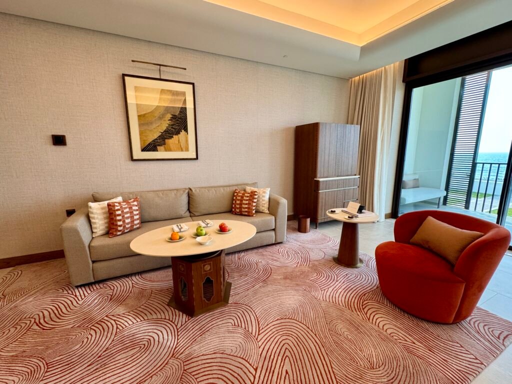 We originally booked a Deluxe Sea View Room but were upgraded to a Junior Sea View Suite, which was 110 sqm and full of natural light thanks to the floor-to-ceiling windows. The suite had a large balcony with comfy seating and gorgeous sea views—we spent a lot of time out there in the mornings and at sunset.