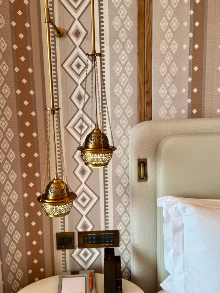 The design was both modern and thoughtful, with strong local Omani elements. The headboard featured the colors and patterns of a traditional Omani hat, and the bedside lamps echoed the hues of a Khanjar (Oman’s traditional dagger). These touches really gave the room a sense of place.