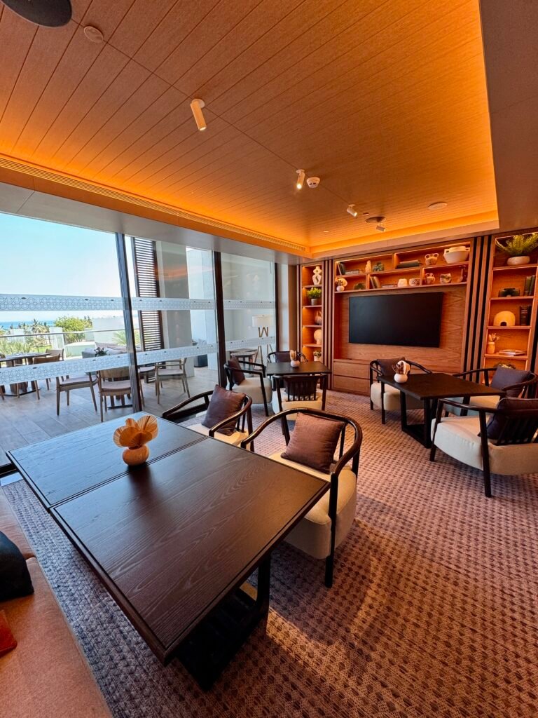 The lobby is a showstopper, with floor-to-ceiling windows overlooking the sea and pool. At its center is a colorful chandelier made of handmade crystal lanterns—a truly stunning feature. The Mandarin Cake Shop is located in the lobby too and seemed popular with locals. We noticed many stopping in to enjoy afternoon tea, adding a lively local feel to the space. It can get very busy throughout the day and on weekends.