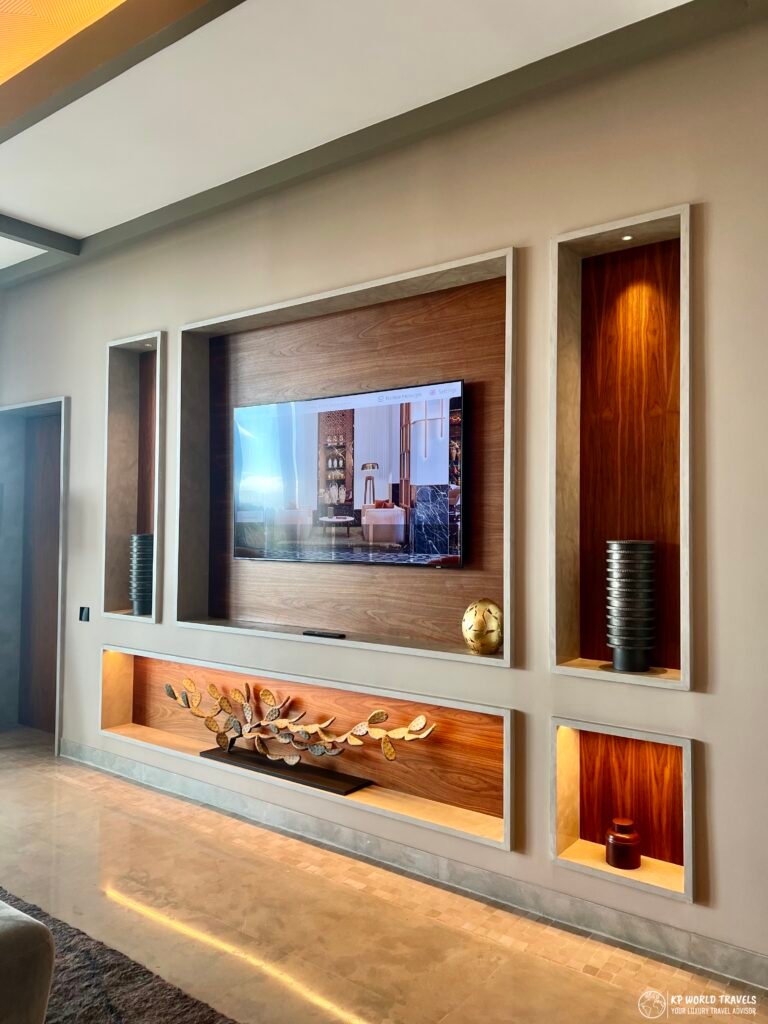 The living room leads into the bedroom, again with bedside tables and dark wood panelling with berber aesthetics. The bedroom’s neutral tones and grey tones mixed with dark wood looks very pleasing to the eye. I particularly appreciated the night lamp next to the bed which reminded me of Etihad’s iconic lamp in their Business Studio seats.
