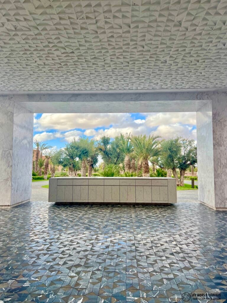 As you pass through the main gates of the resort, the Park Hyatt Marrakech staff will warmly welcome you at the beautiful entrance. The drop-off area exudes luxury with floor-to-top marble, a key element of this resort. As far as grand entrances go, an entrance can’t be any grander than at the Park Hyatt Marrakech.