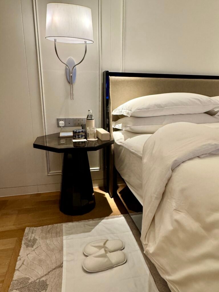 Each evening, the turndown service added a thoughtful touch to our stay. A bottle of water was placed by our bedside, accompanied by a small snack/treat next to our bed. I loved the comfortable fluffy slippers next to the bed and our garments were neatly folded away. The little details truly stood out..