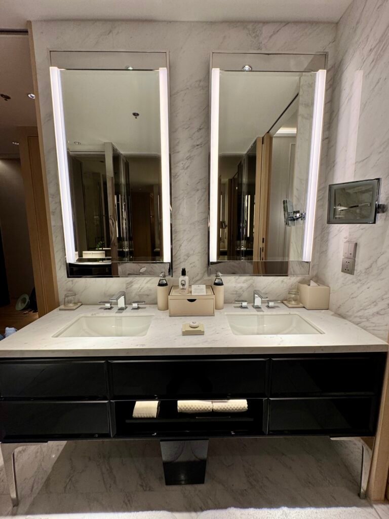The bathroom was fully marble, featuring a separate shower area, an electronic toto washroom and a spacious double vanity; a must in a true luxury hotel in my opinion. There were a few amenities provided in the bathroom along with glass water bottles fully encased in leather sleeves.