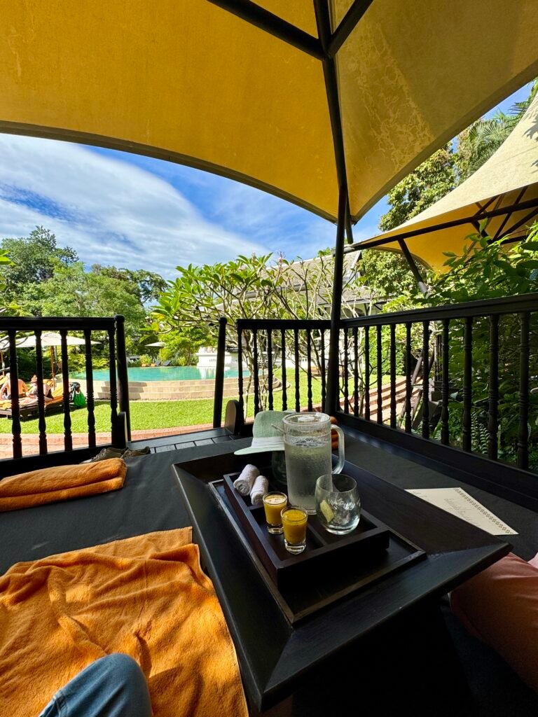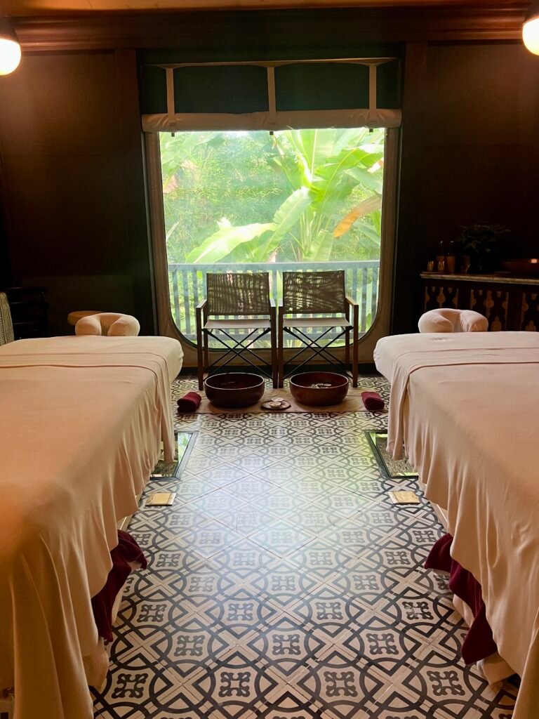 The staff escorted us to our couples’ spa room. The beds featured a glass floor panel offering views of the river flowing below—complete with the occasional surprise visitor, like the snakes we spotted half-way through our treatment! The combination of jungle sounds, flowing water, and expert treatments created a deeply calming experience. In fact, it came a close second to the Alila Jabal Akhdar spa in the mountains, one of the most memorable spa experiences we’ve ever had.